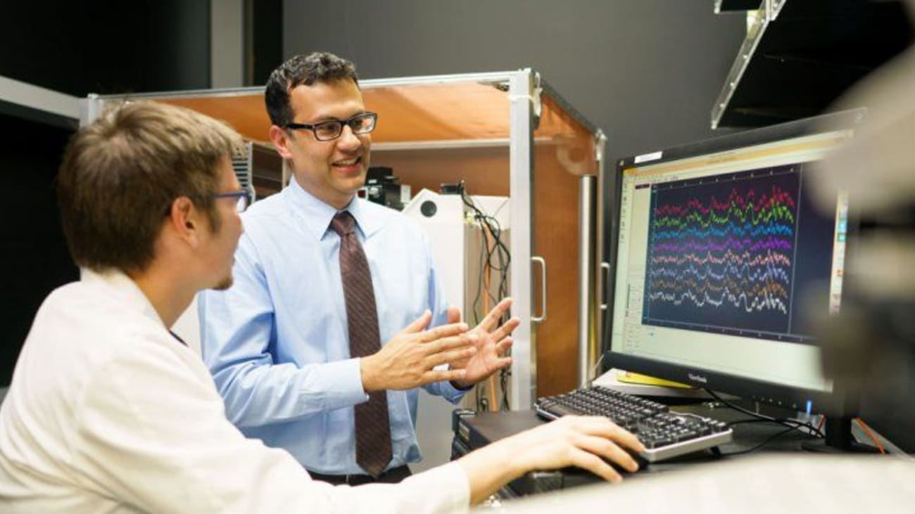 Karunesh Ganguly (right), MD, PhD, discusses ECoG brain recording data with student Stefan Lemke in 2016. Photo by Steve Babuljak